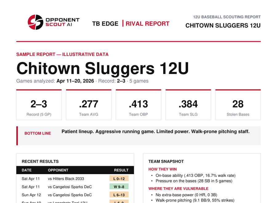Opponent Scout AI reads the stats, PDFs, and screenshots you already have and delivers a pre-game scouting report and dugout-ready summary in minutes, not hours.