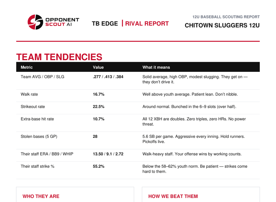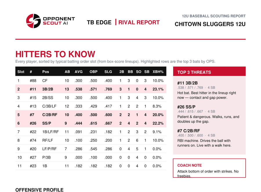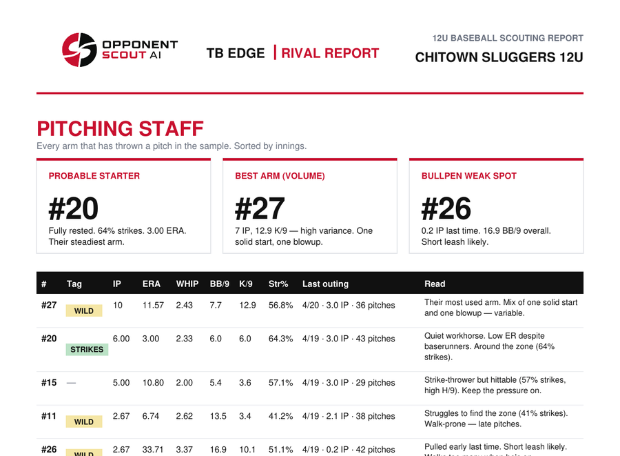 Every Rival Report comes as a polished PDF plus a one-page dugout card. Written for the coaches’ meeting, sized for the lineup book, ready for the bench.